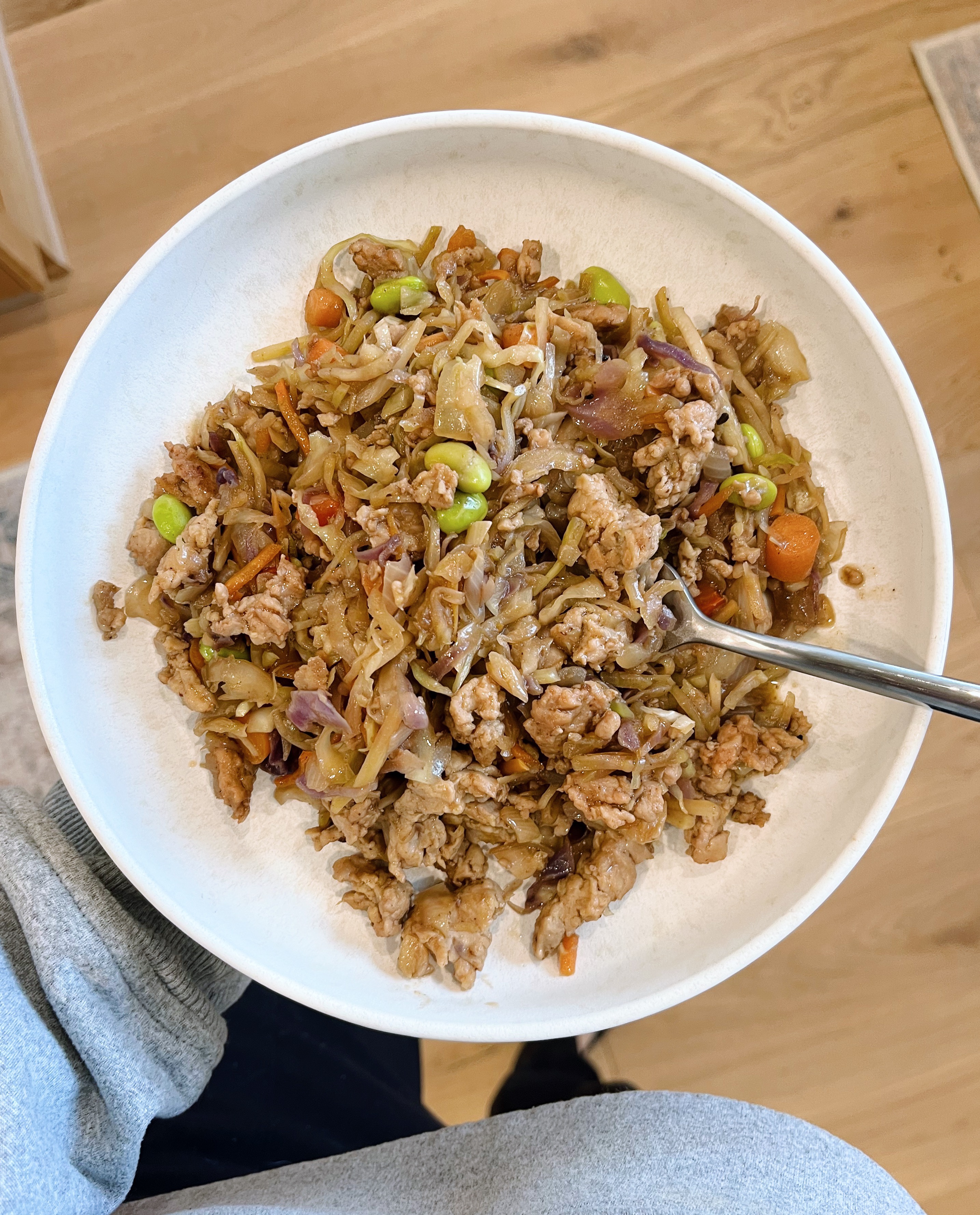 This meal was born out of the fact that I used up all of our soy sauce/coconut aminos in Wednesday night’s dinner. I initially planned to make our favorite egg roll in a bowl recipe but when I went to add coconut aminos to the skillet, I remembered I used it all up the previous evening. I quickly pivoted and used some General Tso’s sauce I bought through Thrive Market in the skillet instead and it worked well! In the skillet: Ground chicken, edamame, carrots, cabbage, onion, garlic, toasted sesame oil and Kevin’s General Tso’s sauce!