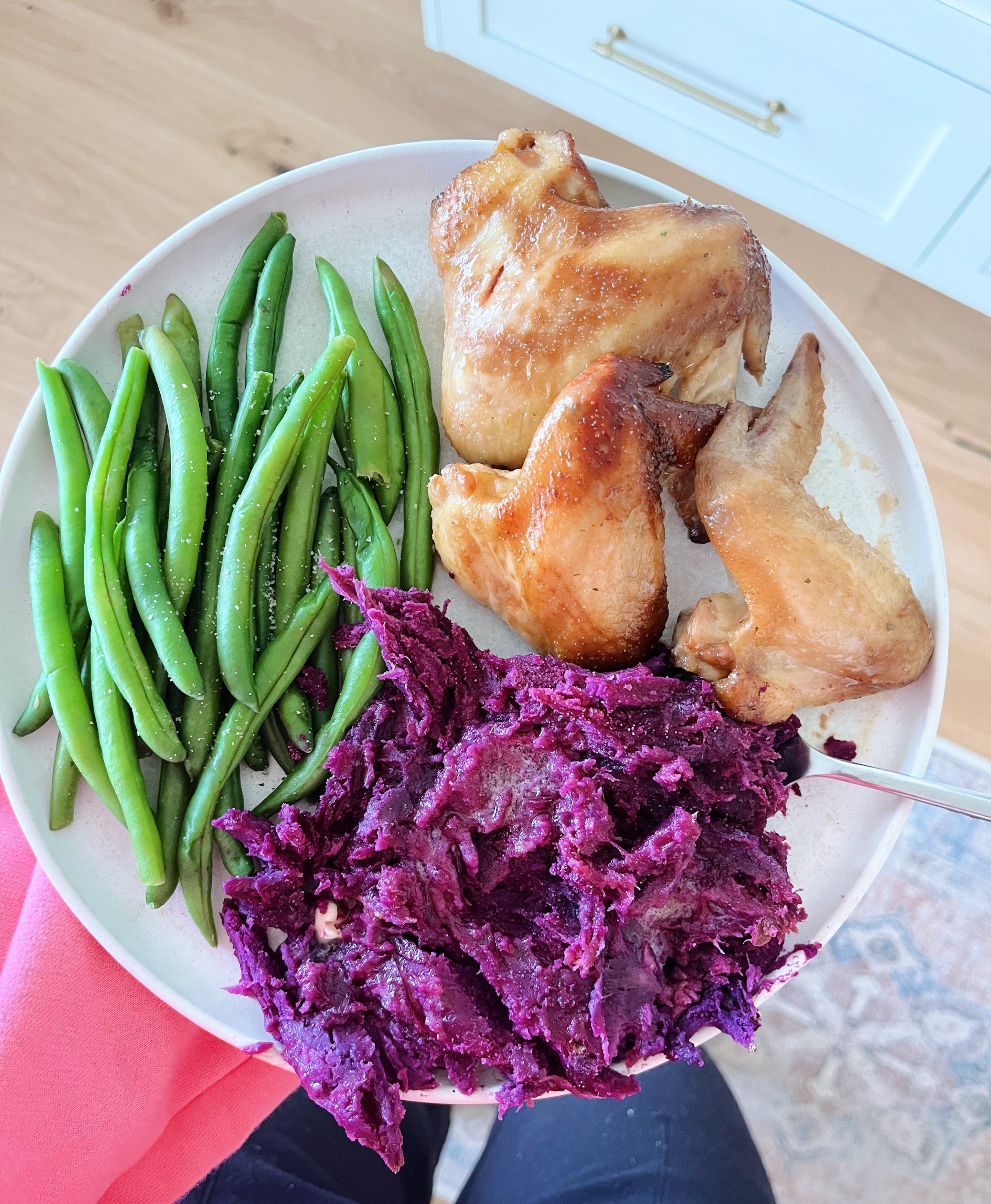 The marinade I used on the chicken wings we had for dinner on Wednesday night is the same one I shared in this blog post for my Easy Marinated Pork Chops! It’s such a simple one and since we almost always have the ingredients on hand, it’s a go-to for me for meat and fish alike. After marinating the chickens throughout the day, I baked them in the oven along with purple sweet potatoes and then I topped the sweet potatoes with butter and salt and served them with steamed green beans seasoned with garlic salt. It was a super simple meal but a good one!