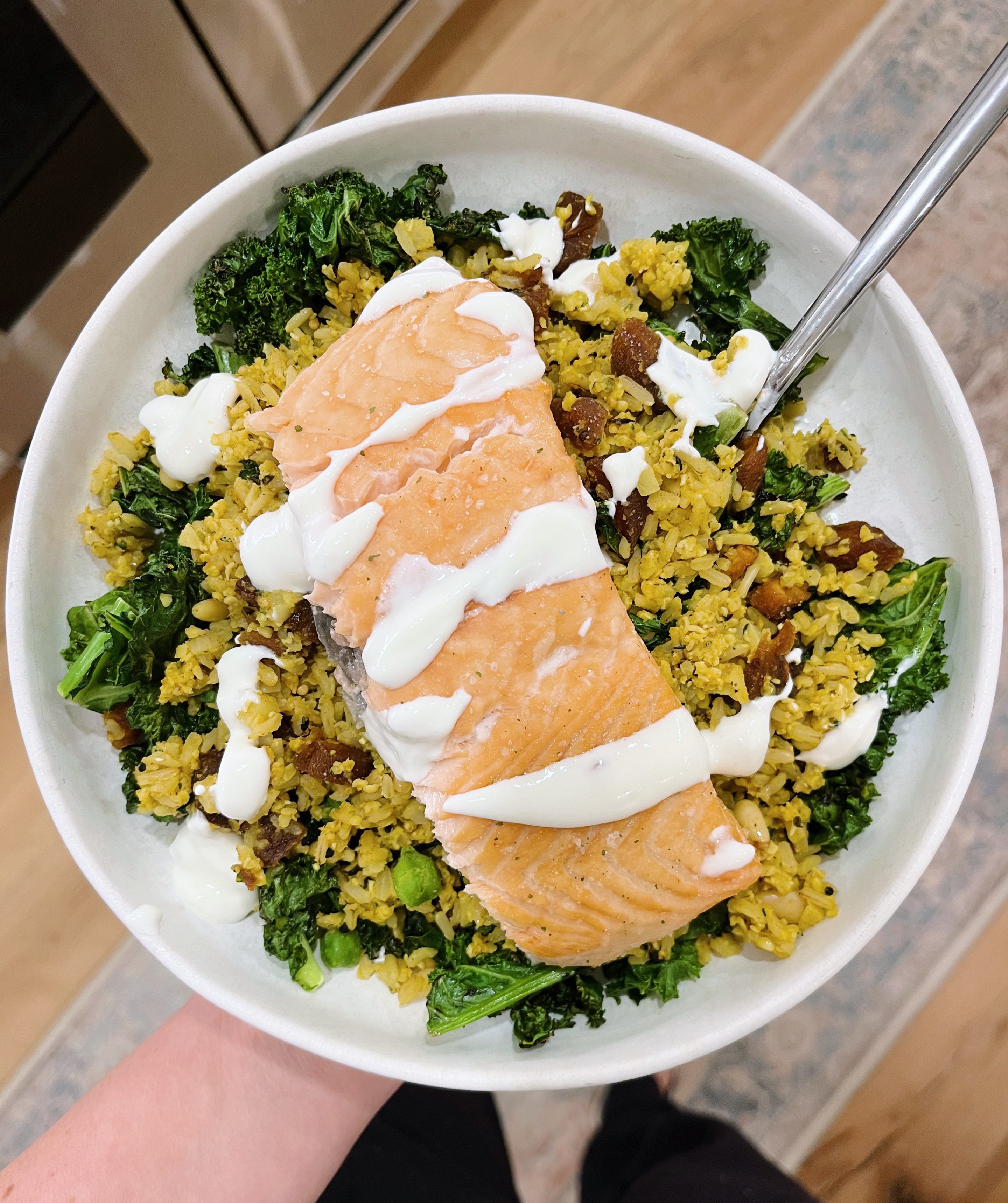 The base of Friday’s nights (leftover) dinner was Daily Harvest‘s new Curried Brown Rice + Green Chickpea Grains and I you better believe I’ll be ordering this flavor from their grains selection in the future. It was SO GOOD. I’m particularly psyched about the new grains options from Daily Harvest because they’re larger and meant to serve multiple people. I’ve been ordering and loving Daily Harvest deliveries for years and have always wished they had more family-friendly options when I want to feed our whole gang in a busy night. This grains mix was incredibly delicious and tasted great served with sautéed kale and topped with salmon and a yogurt-lemon sauce made with full-fat Greek yogurt, fresh lemon juice and salt.