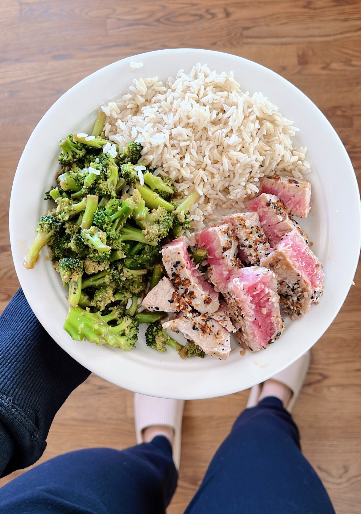 This recipe for Everything Bagel Seared Tuna is still my go-to recipe for tuna! I honestly don’t think I’ve made a different tuna recipe in years because we love this one so much. We ate our tuna with simple sides — brown rice and our favorite ginger sesame broccoli — and enjoyed this meal a lot.