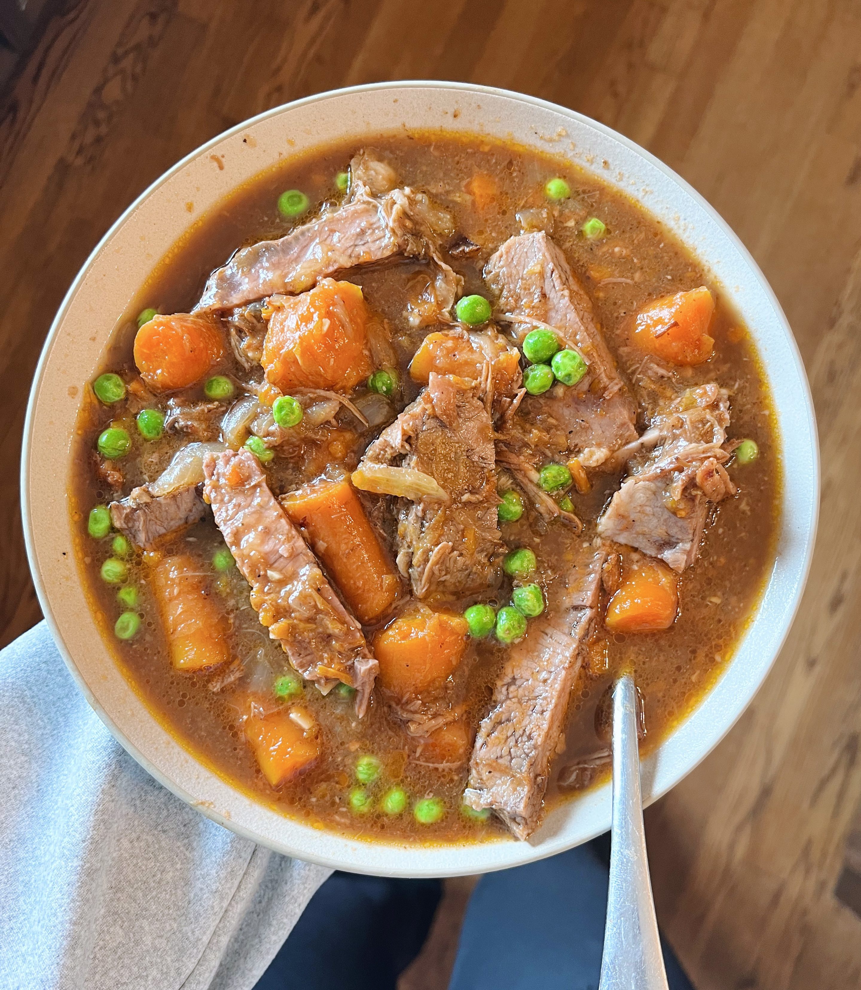 I made a super shortcut pot roast on Thursday night. My two shortcuts: Using the Instant Pot and relying on a packet of ALDI’s Cook House slow cooker pub-style pot roast sauce for flavor. I first seared the meat using the sauté function of the Instant Pot and then added the sauce, carrots and onions and cooked it on high pressure for 45 minutes. I then added some frozen peas to the mix and served it up with a sprinkle of garlic salt, lots of the broth all over everything and biscuits on the side.