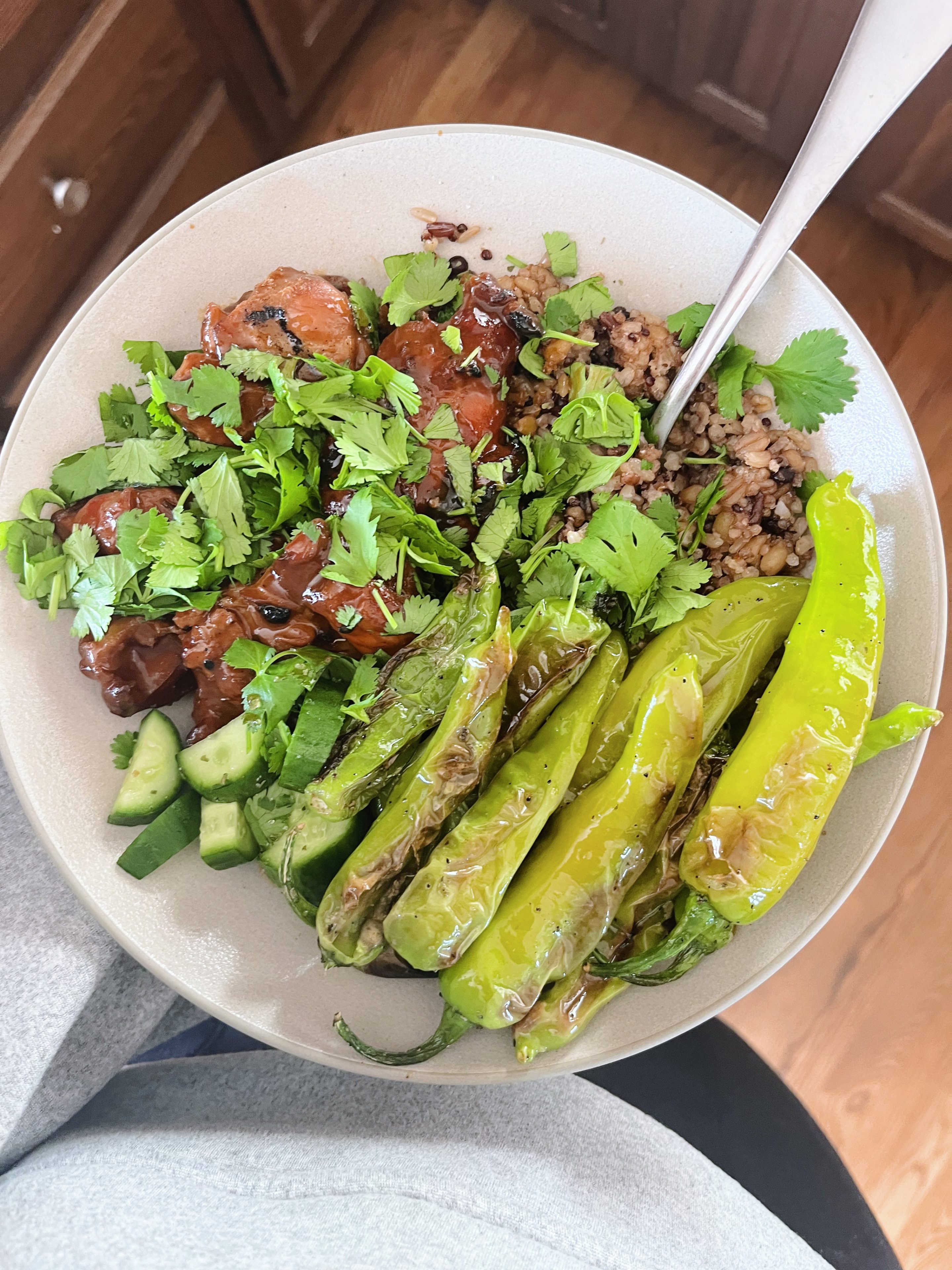 Our week began on a high note with Monday’s Korean BBQ chicken bowls! (This was both Ryan and my favorite meal of the week!) I followed this recipe from Boulder Locavore for the chicken and served it on top of mixed grains along with cucumbers, blistered shishito peppers, salt, pepper and lots of cilantro. All of the flavors worked so well together and I will absolutely be making this one again.