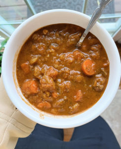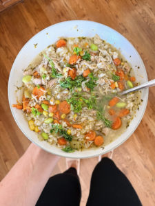 It’s soup season and I am a soup-lover through and through for a myriad of reasons. I love one-pot meals for the ease of clean up and adore cramming as many veggies as I can into soups so they pack a decent nutritional punch, too. To make Monday night’s soup, I sautéed garlic, carrots, onions and celery in avocado oil in the Instant Pot and then added chicken thighs, chicken broth, turmeric, salt, pepper, oregano, thyme and rosemary before pressure-cooking the soup for 18 minutes. I then shredded the chicken and added frozen edamame and frozen corn to the soup before stirring in cooked sprouted brown rice. I topped the soup with fresh parsley and we absolutely loved this comforting meal! An added bonus: It was great for leftovers for lunch throughout the week!