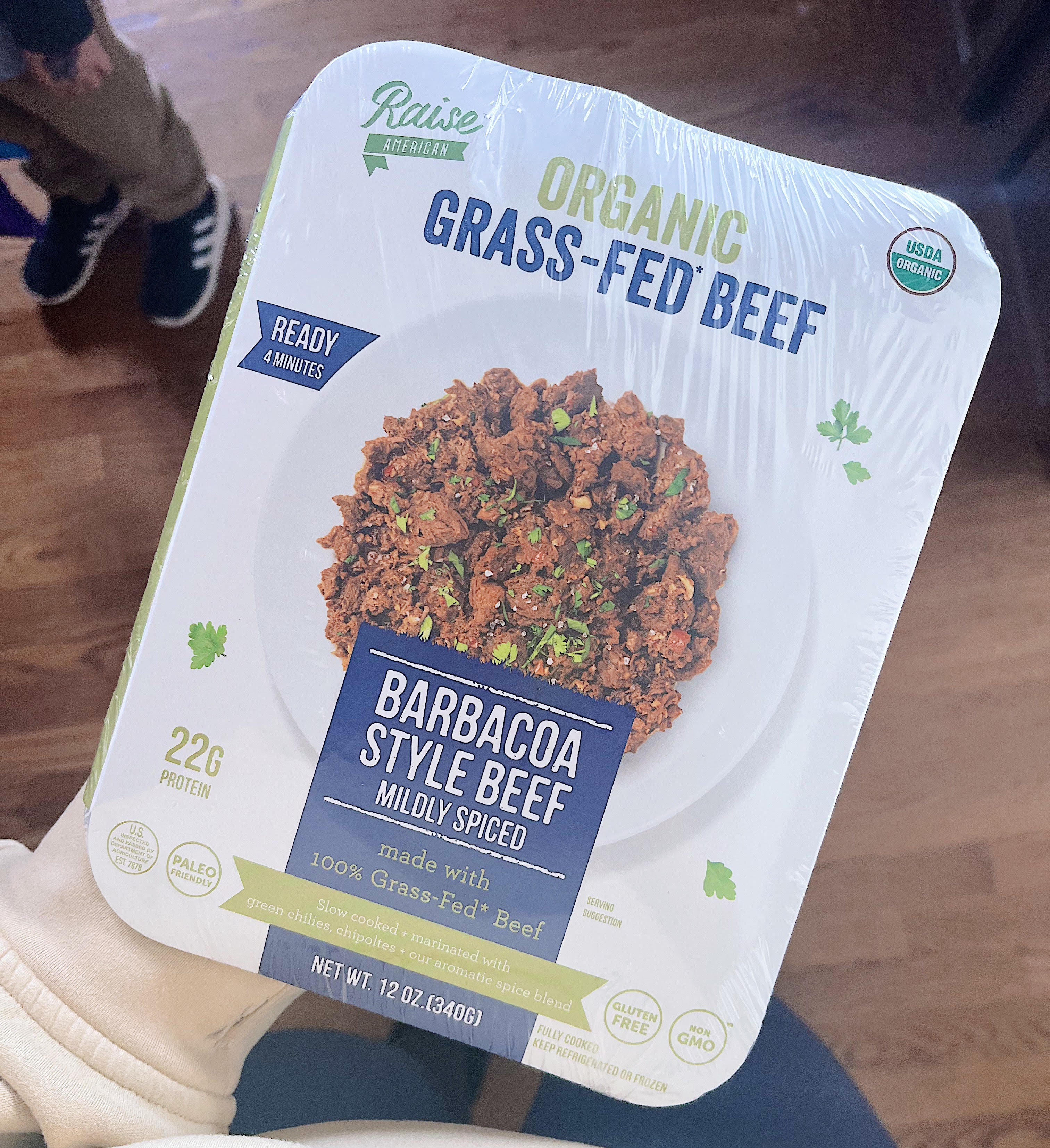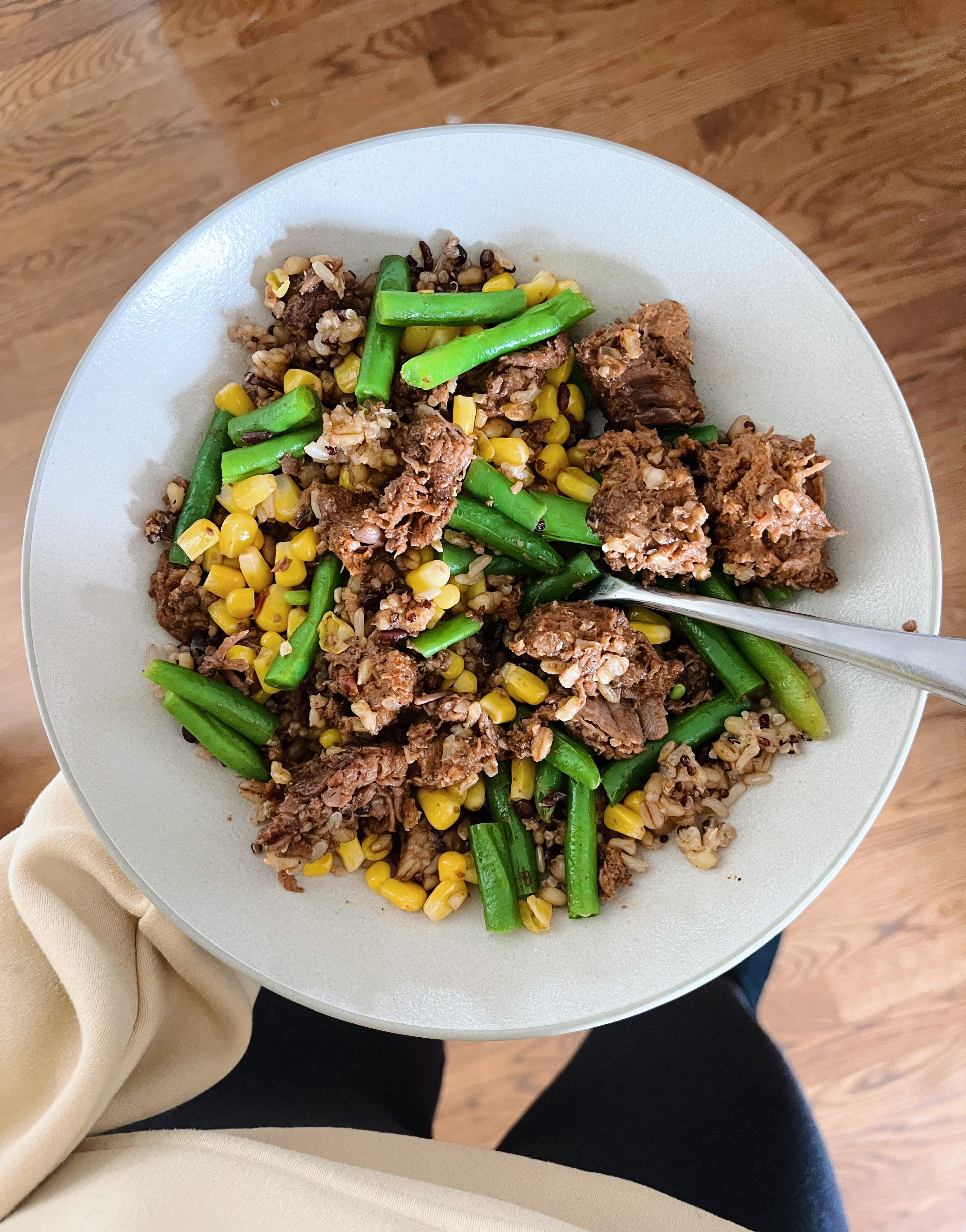 Ryan had a work dinner on Tuesday night so I was riding solo and opted to keep dinner extra simple. I heated up a package of pre-made organic grass-fed barbacoa-style beef I bought from ALDI in a skillet with avocado oil before adding frozen corn, fresh steamed green beans and a pouch of 90-second mixed grains from ALDI. It was delicious and I had enough leftover in the skillet for lunch the next day, too!