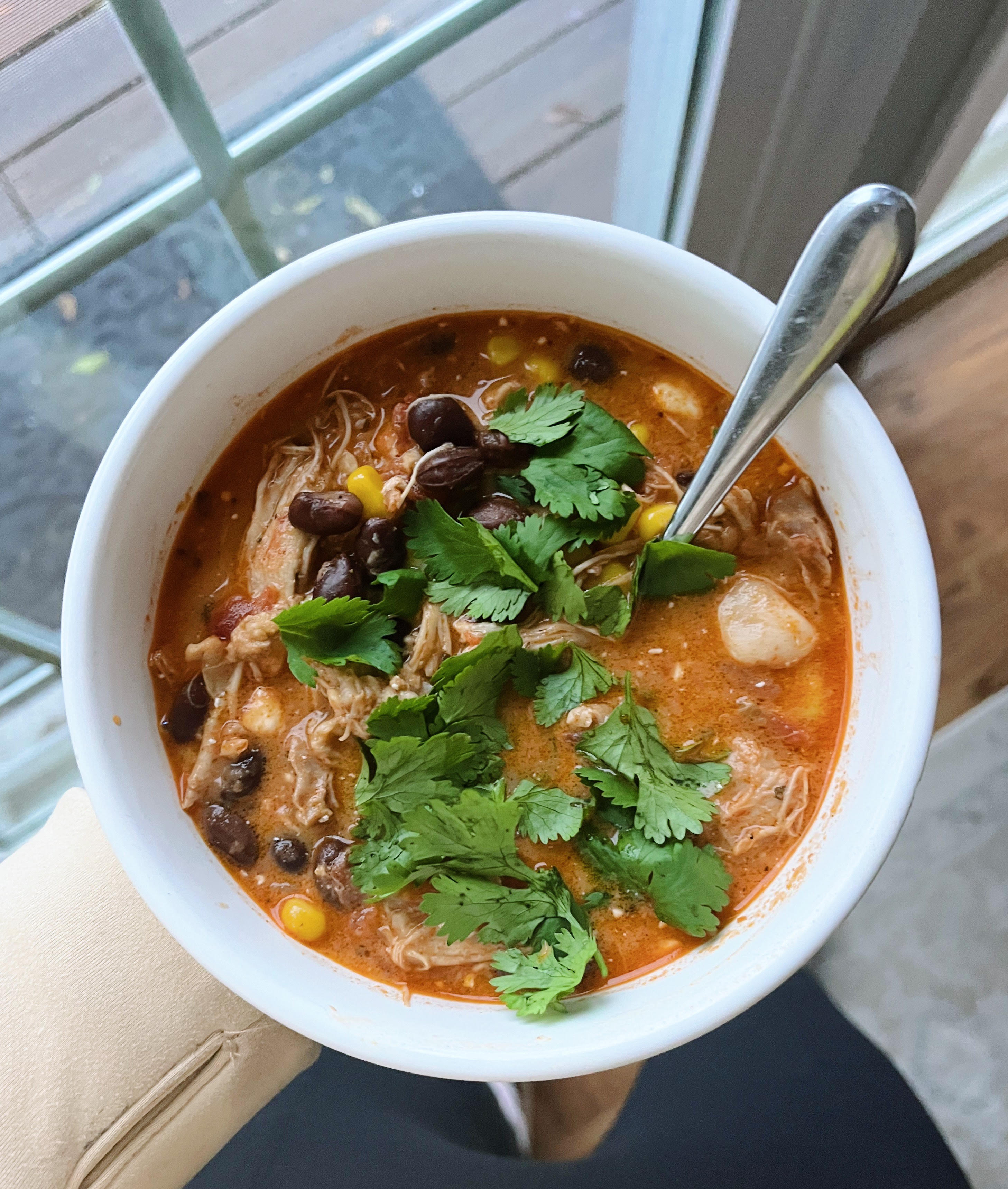 It’s soup season and I am a soup-lover through and through for a myriad of reasons. I love one-pot meals for the ease of clean up and adore cramming as many veggies as I can into soups so they pack a decent nutritional punch, too. To make Monday night’s soup, I sautéed garlic, carrots, onions and celery in avocado oil in the Instant Pot and then added chicken thighs, chicken broth, turmeric, salt, pepper, oregano, thyme and rosemary before pressure-cooking the soup for 18 minutes. I then shredded the chicken and added frozen edamame and frozen corn to the soup before stirring in cooked sprouted brown rice. I topped the soup with fresh parsley and we absolutely loved this comforting meal! An added bonus: It was great for leftovers for lunch throughout the week!