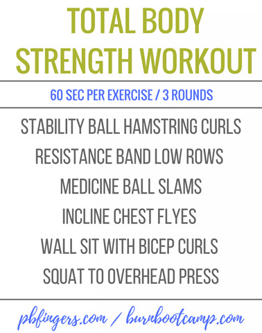 I made it to Burn Boot Camp for a total body strength workout on Friday and though I kept my weights relatively light and eliminated some plank exercises our trainer incorporated into the workout, I felt like it was a good one! (The above workout is the one I completed.) I was feeling unexpectedly energetic and it felt great to get in the gym and move my body.