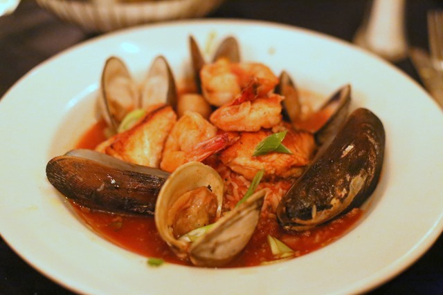 Once our table was ready at Vic’s we ordered appetizers and had no trouble polishing off buttery biscuits with honey butter before our entrees were ready. I opted for the seafood bouillabaisse and it came out packed with lots of shellfish, scallops, shrimp and salmon over rice.