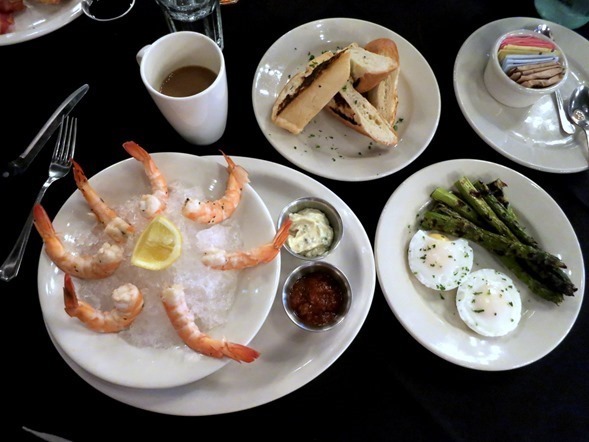 After perusing the menu, I realized I was in the mood for a billion different things, so I created a hodgepodge breakfast by combining a shrimp cocktail appetizer with the most deliciously thick and hearty toast, eggs and grilled asparagus.