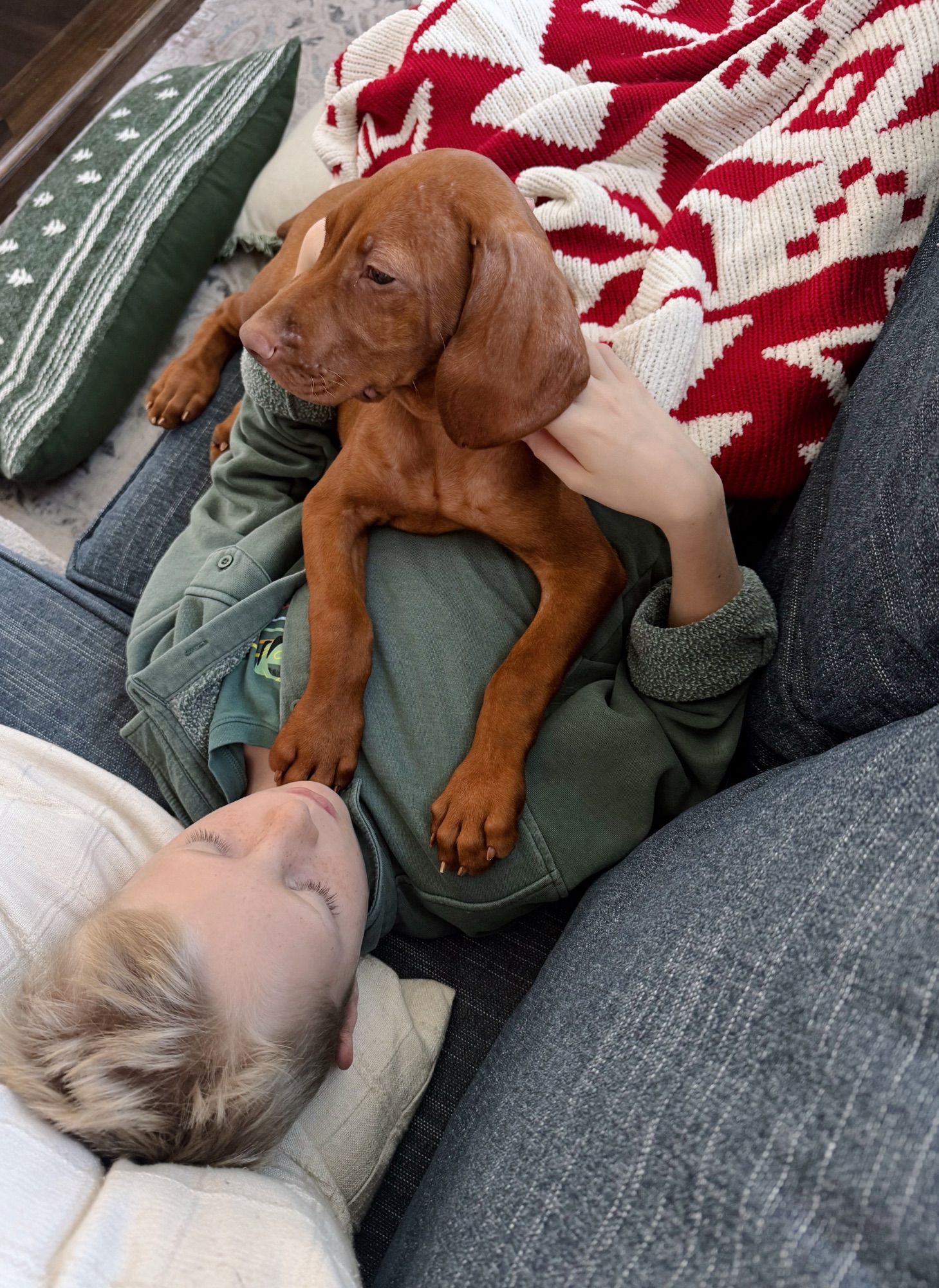 Our boys named this little guy Comet after the reindeer since we got him so close to Christmas but they also loved the name because vizslas are speedy like a comet and his name obviously has a space connotation which they like a lot, too. And doesn’t Comet just feel like a happy name!? So far Comet’s personality is one I would liken to Buddy the Elf. He’s easy-to-please, incredibly joyful, floppy and clumsy and next-level adorable.