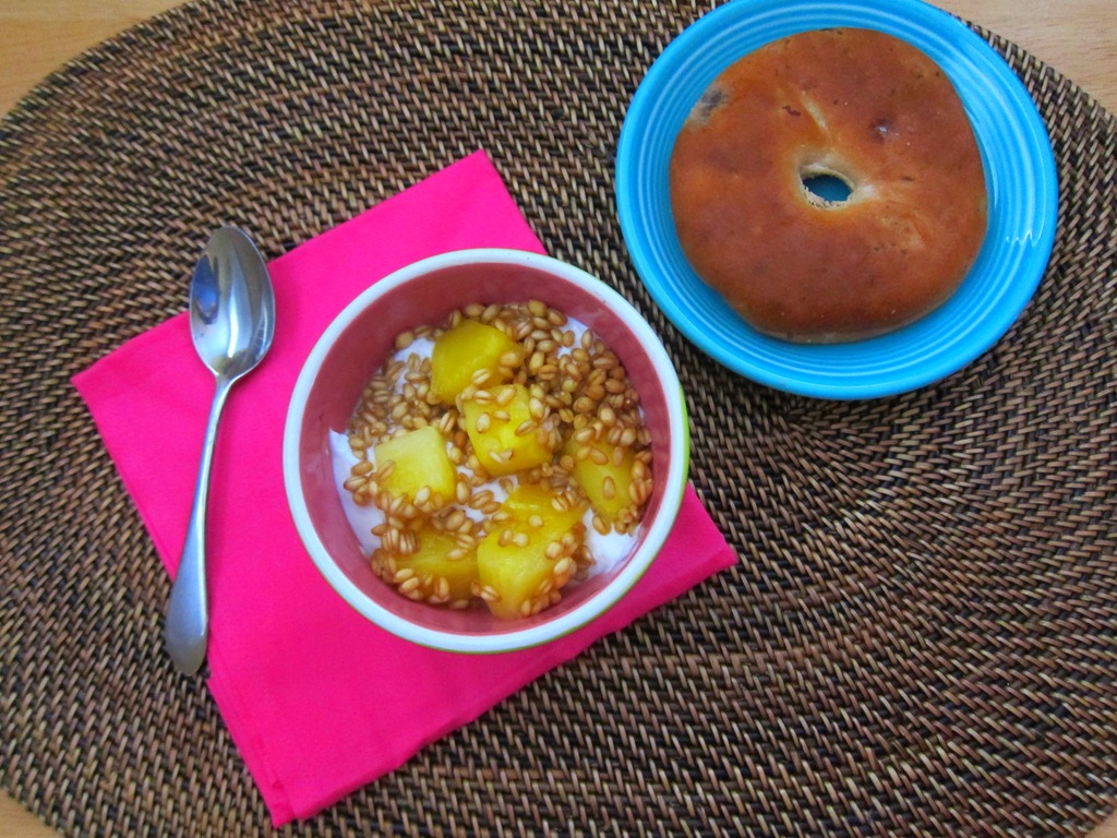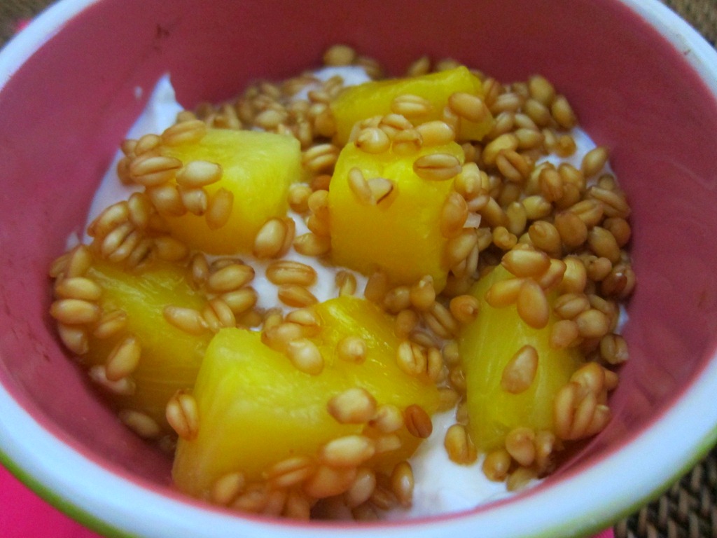 My yogurt bowl included the wheat berries, honey Greek yogurt and thawed frozen pineapple slices.