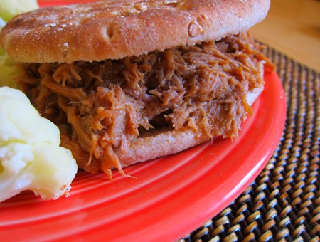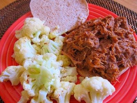 Last night we enjoyed pulled pork and had some leftover that I incorporated into our lunch this afternoon. I coated the pork in the Bone Suckin’ Sauce and Ryan and I enjoyed BBQ pulled pork sandwiches with a side of roasted cauliflower.