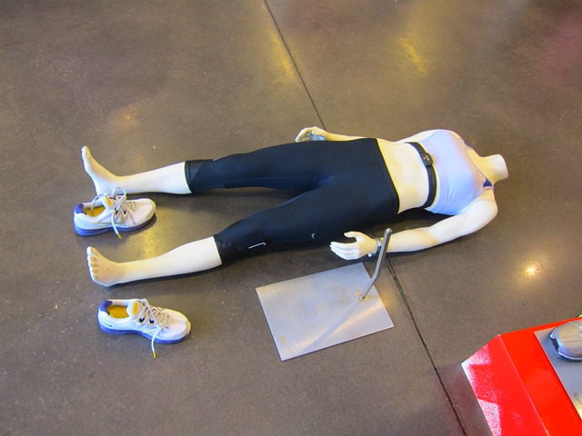 Clearly the mannequin at the Nike Outlet pushed herself a little too hard this morning. I tried to explain to her the importance of rest days in a good workout regimen, but I just wasn’t getting through to her. Maybe it was her lack of ears? Or head?
