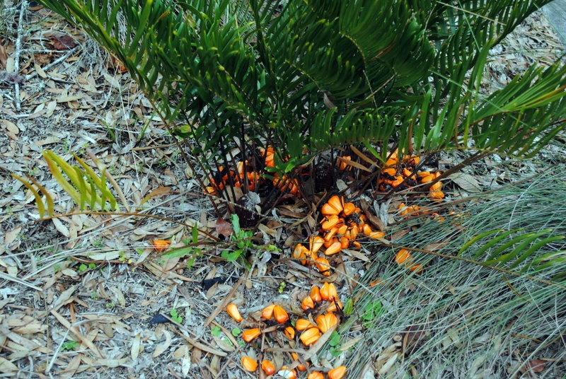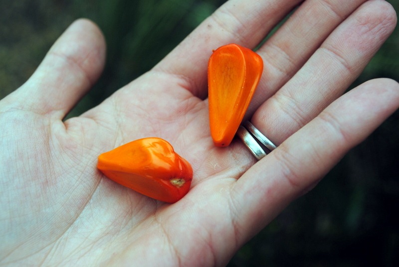 At first I thought someone emptied a bag of Cheetos at the base of the plant, but when I looked closer, I saw that the bright orange things were actually seeds!