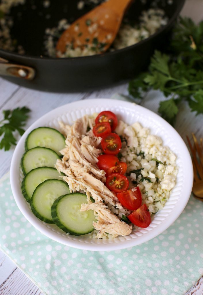 I’ve made boatloads of cauliflower rice over the years but typically stick to simple garlic cauliflower rice, cilantro lime cauliflower rice or cauliflower fried rice recipes. The cauliflower rice from Zoe’s kitchen was fresh and flavorful and appeared to be made with a simple mix of herbs and tangy lemon juice. Simple enough! I’ve got this!